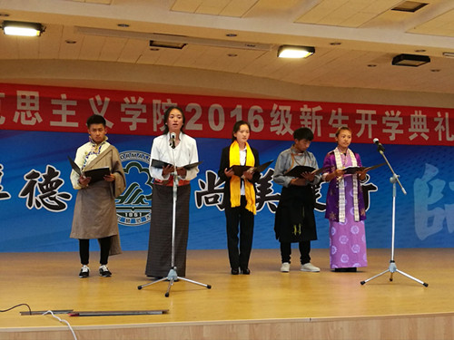 来自西藏自治区的五名新生带来了诗朗诵我最爱的家乡——西藏,展示了藏族儿女的热情与魅力,正如尾声中西藏学子所说:“一批批藏族学子走出大山,在祖国内地学习知识,增长才干。今天我们在沈师求学成长,明天我们在西藏建设发展。”将现场的气氛推向高潮。