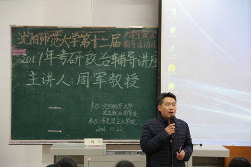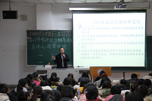 周军教授从考研政治形势变化、2016年社会热点问题、近七年真题分析比较、对2017年试题预测四个方面进行细致的解析。首先,以国内外时事热点为切入点,针对七一讲话、十八届六中全会、长征胜利八十周年、G20杭州峰会、美国总统大选等问题进行分析,归纳出题点。同时,结合具体实例,传授考研政治答题技巧。最后,对近七年的各类考题进行分析,指导员工如何提炼信息点,提出应试建议。讲座持续了将近两个小时,深入解析了考研政治的重点难点,增强了同学们应对考研政治的信心。