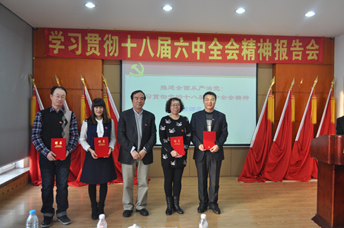 理论宣讲团在认真学习、集体备课后,又认真学习了辽宁省委机关工委副书记赵满同志关于学习贯彻党的十八届六中全会精神的报告。20161212日下午1:303:00,理论宣讲团为辽宁省基础教育教研培训中心百余名党员干部作了题为《推进全面从严治党——学习贯彻十八届六中全会精神》的首场理论宣讲。参加本次理论宣讲的有EMC易倍秦晓波、王刚、李福岩与王英伟四位宣讲团成员,宣讲报告会由辽宁省基础教育教研培训中心副书记武丕才同志主持。