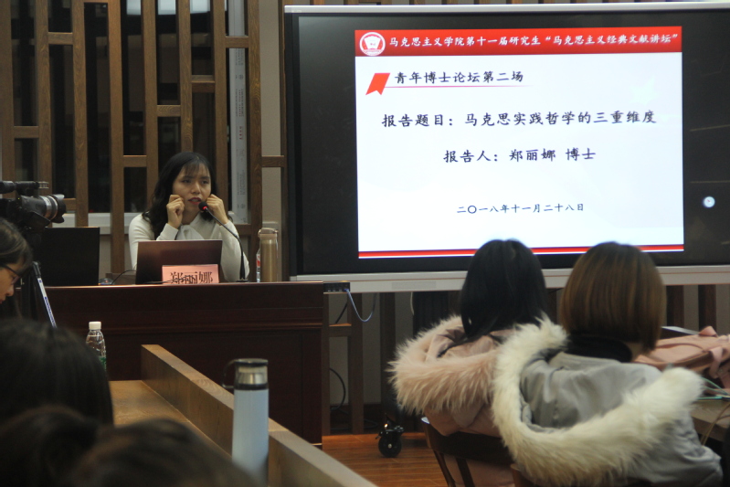 郑丽娜博士给我们带来题为《马克思实践哲学的三重维度》的学术报告。她从感性维度、历史维度与自由维度互动与统一过程三方面深刻剖析了马克思实践范畴总体性的内在意蕴,她认为这是马克思实践范畴超越以往实践观点的关键之处。首先,她将马克思实践范畴的感性维度概括为:现实的个人活动,即以对象、现实、感性当作感性的人的活动,理解为人的实践,划清了与传统思辨哲学和直观唯物主义的界限,使得马克思实践范畴成为一种新的思维方式。其次,她将马克思实践范畴的历史维度进行总结概括为:劳动生产过程。她指出历史维度是劳动生产的展开过程,以现实的个人活动的感性维度为前提,而现实的个人活动的感性维度的核心就是生产劳动。最后,她将马克思实践范畴的自由维度概括为:现实的个人的联合,她详尽论述了马克思通过现实的个人的感性维度和历史维度,最终通达至一个现实的个人联合的自由维度。郑丽娜老师的学术报告让在场的研究生同学对马克思的实践观有了更深层次的认识和理解。