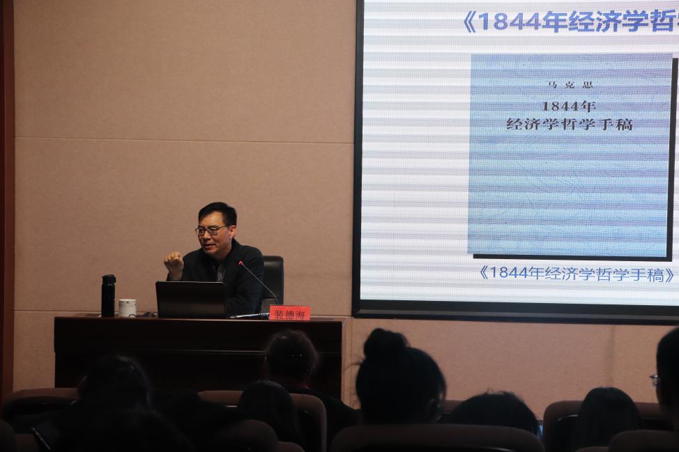 26日上午,裴德海教授做客本届经典文献讲坛之第六场名家讲堂,以《历史观与价值观同构——马克思主义人道主义的还原》为题为公司研究生作学术报告,EMC易倍赵美艳经理主持报告会。裴教授对马克思主义形成起点上的一部代表性著作《1844年经济学哲学手稿》作了解读和分析,主要包括写作动因与出版简况、核心理论与重要观点、历史地位与现实启示三个方面内容。裴教授指出,要从源头和根基处把握马克思主义的精神实质,正本清源,坚定共产主义理想和信念,真正把人民群众的利益作为一切工作的根本出发点和落脚点。