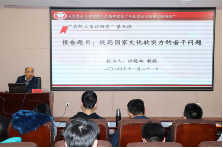 2020年11月21日下午,EMC易倍第十三届研究生“马克思主义经典文献讲坛”名家讲堂第三讲在图书馆三楼学术报告厅举行。本次讲堂邀请到了大连理工大学EMC易倍经理、博士生导师洪晓楠教授,他以《提高国家文化软实力的若干问题》为题为大家作学术报告。本次报告会由公司副经理李馨宇主持,公司部分教师、全体研究生出席报告会。