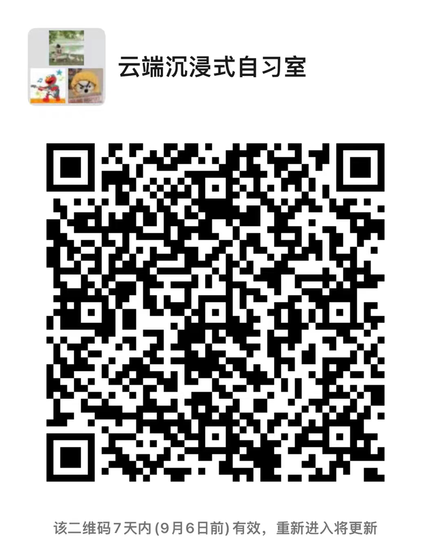 大家通过扫码加入下面微信群,根据自己的课程安排选择适当时间进入云自习室,自9月1日起每天早上由管理员准时发布云自习室“会议号”,每天结束学习后在微信群内分享每日的学习内容、心得体会,在完成目标后打卡。