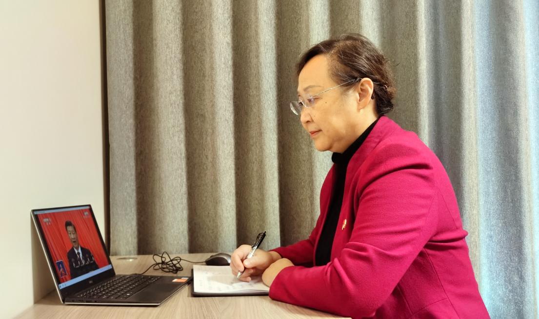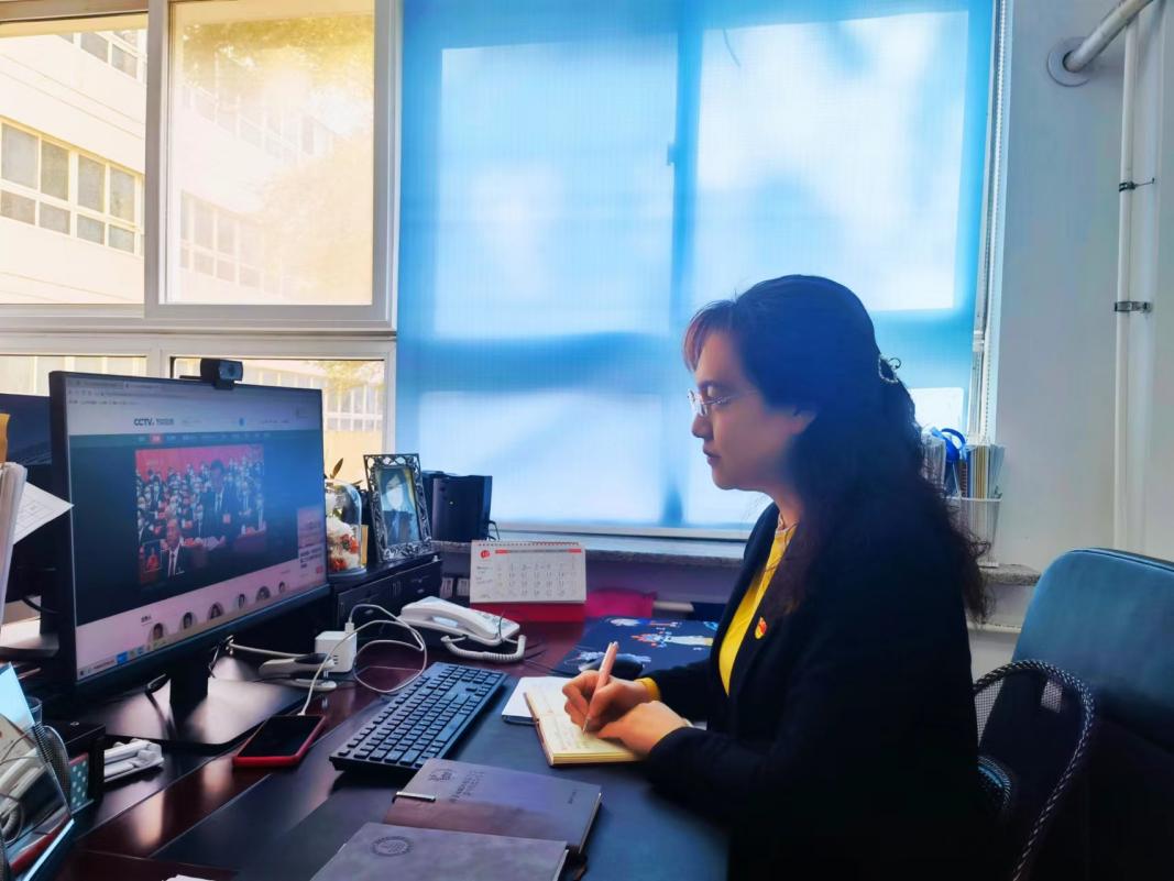 EMC易倍经理赵美艳教授在办公室观看党的二十大直播并认真记录