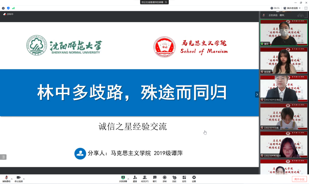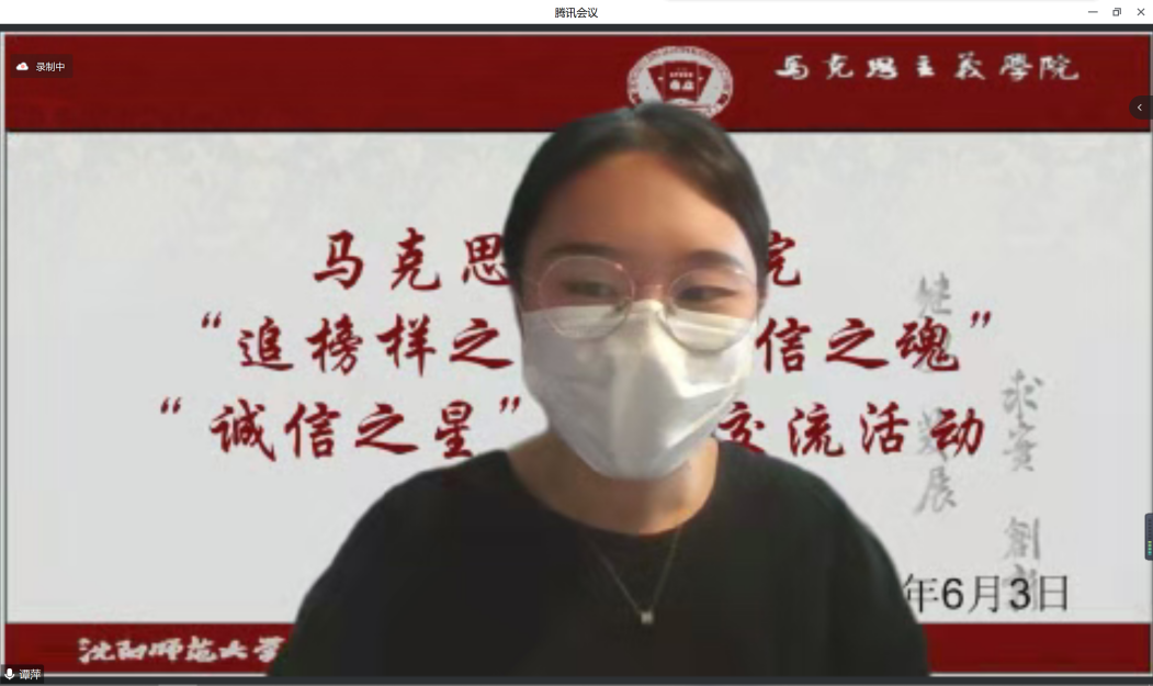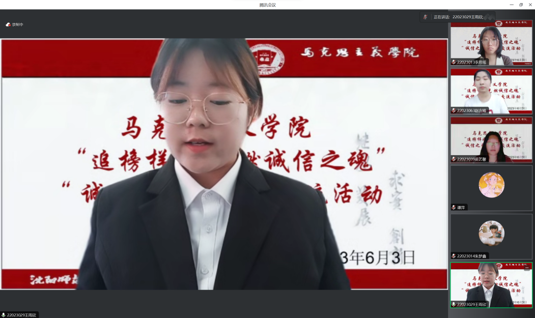谭萍同学从学习诚信、科研诚信以及生活诚信三个层面向同学们分享了她的诚信感悟。学习诚信层面,谭萍同学在提醒同学们合理安排时间、把握学习节奏的同时,也要做到诚信学习和诚信考试,学以载道、诚信求知,让自己变得更加优秀;在科研诚信层面,她详细讲述了创新创业比赛中各个阶段的应对技巧,同时提醒同学们要做到学术诚信,不抄袭、篡改他人作品;在生活诚信层面,她鼓励同学们倾注全力才能久久为功,特别是要注重培养诚信品质,守信于己、诺信于人、践信于行,做一个诚实守信的好青年。