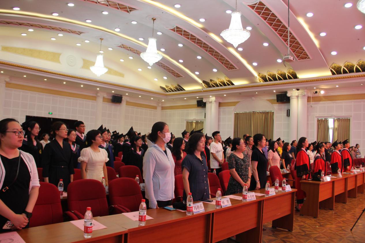 典礼第一项,全体起立,奏唱国歌。在庄严的国歌声中,2023届毕业典礼暨学位授予仪式拉开帷幕。