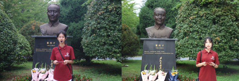 紧接着,宣讲团成员王笑澜、王晨阳于图书馆董纯才雕像前展开宣讲,她们用生动感人的语言诠释了董纯才先生“心有大我、胸怀天下”的远大抱负,“以文化人、至诚报国”的使命担当,展现了中国特有的教育家精神。依托董纯才先生的故事,宣讲员们强调广大青年要坚定不移听党话、跟党走,始终牢记习近平总书记的谆谆教导,自信自强、担当奋斗、踔厉奋发、勇毅前行,践行“心有大我、至诚报国”的理想信念,树立“勤学笃行、求是创新”的躬耕态度,在中国式现代化建设中挺膺担当。