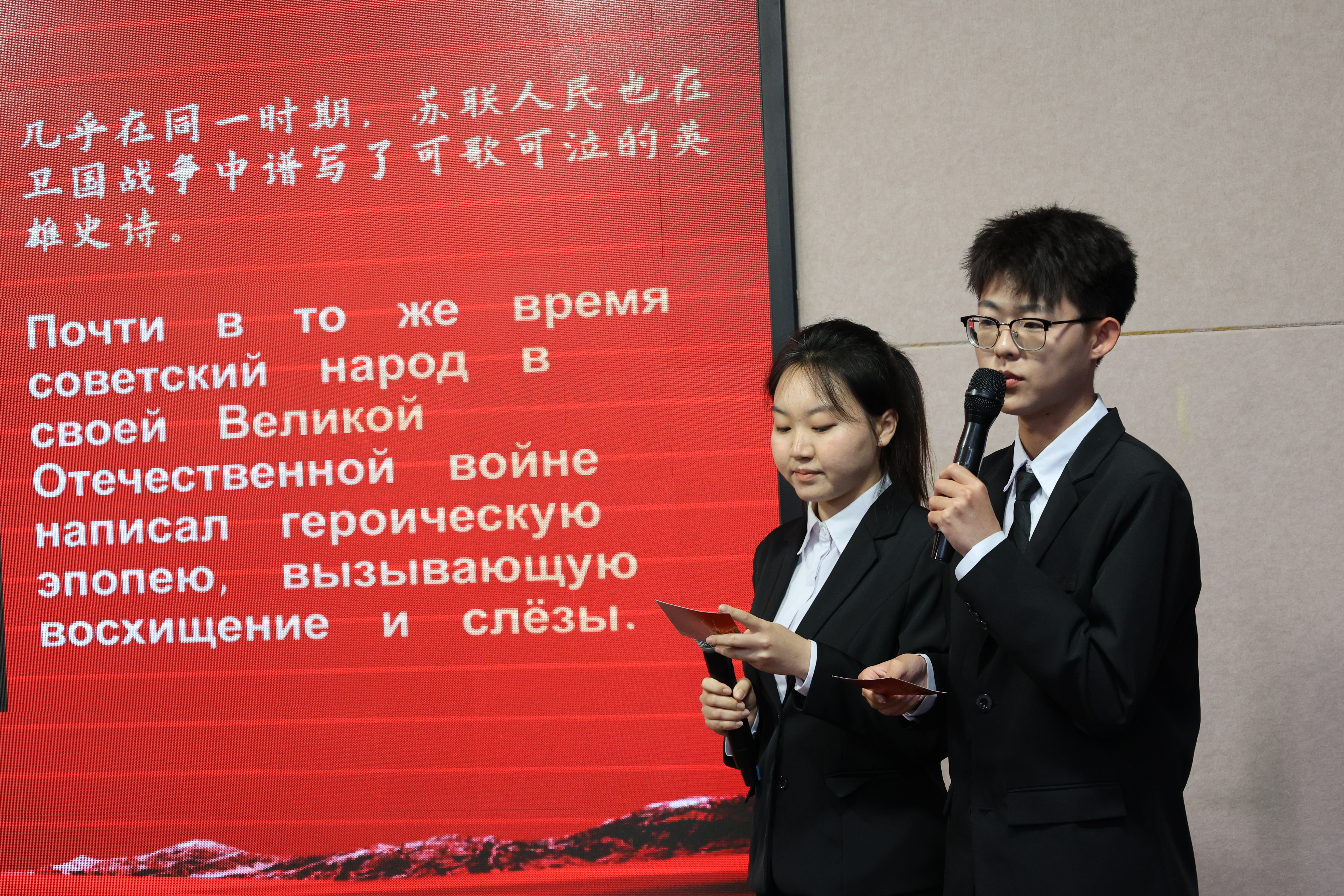 公司老员工党建学会成员生动讲述了中俄两国在世界反法西斯战争中的卓越贡献。中国人民历经14年浴血奋战,以巨大牺牲赢得抗战胜利,苏联军民在卫国战争中顽强抵抗,粉碎法西斯侵略图谋。历史昭示和平珍贵、正义必胜。作为新时代青年,学子们要铭记历史,践行爱国精神,传承中俄情谊,携手共创美好未来。