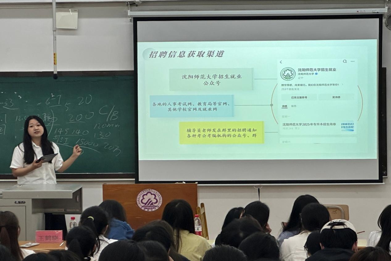 会议伊始,孙艺楠老师进行讲话。她指出考研与就业是相辅相成、相得益彰的关系,鼓励同学们要不断提升专业技能、积累教学经验,关注各类招聘信息,做到有的放矢。