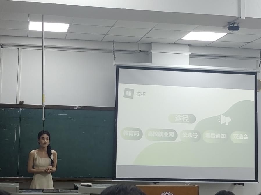 接下来是就业经验分享环节,2021级孙菀婷同学聚焦校招和考编内容进行了详尽的梳理。校招方面,她提醒同学们要提前关注目标集团招聘信息,完善简历,突出自身优势与岗位匹配度。面试时,要注意形象礼仪,做到穿着得体、举止大方,回答问题要条理清晰、真诚自信。考编方面,建议了解考编流程与考试内容,制定合理备考计划。通过做真题、参加培训等方式,提升专业知识和应试能力。